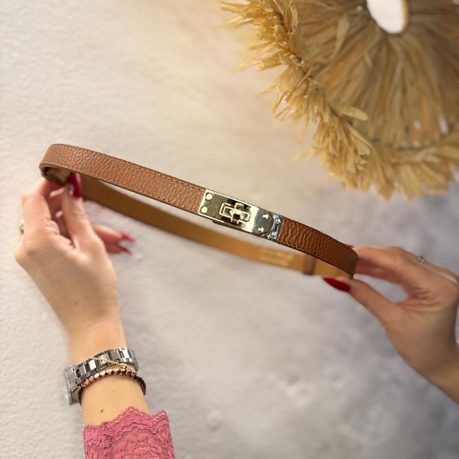 Cintura in vera pelle realizzata interamente a mano in Italia; taglia unica; si allunga in un solo gesto, perfetta per completare il tuo look. Il design minimal è impreziosito dalla fibbia in metallo color oro antigraffio con chiusura girevole.